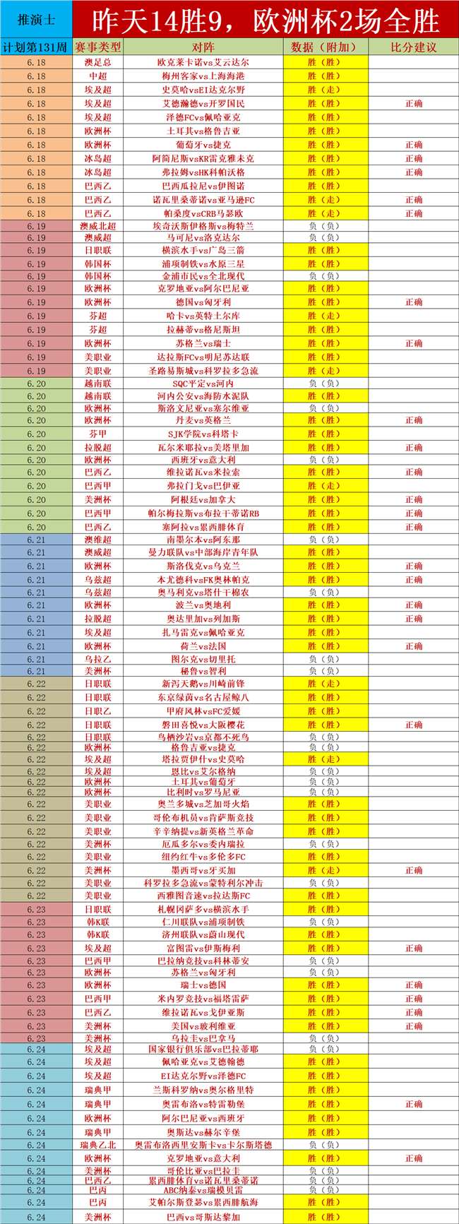 1、昨天状态继续炸裂,拿下14胜9的佳绩,欧洲杯2场全胜,并且击中2场比分,继续超高含金量的观点建议,昨天2场欧洲杯全胜,阿尔巴比亚小负观点十分准确,意大利的进球数稳稳打出,美洲杯巴西顺利打出。