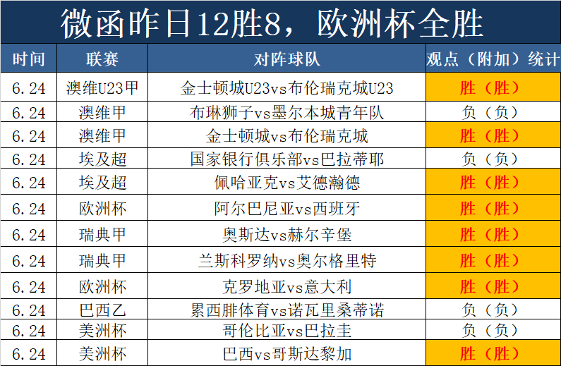 昨天打出12胜8平的成绩,早场澳系3胜2,瑞典甲2场全胜,欧洲杯2场大获全胜,再次狂胜,今天狂胜节奏继续。