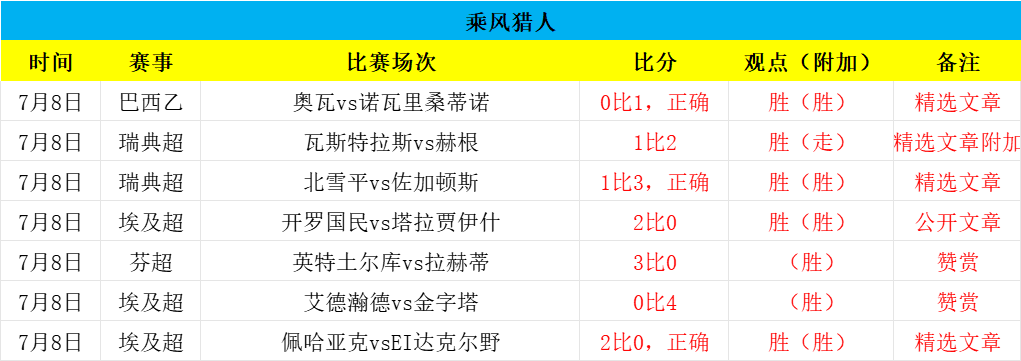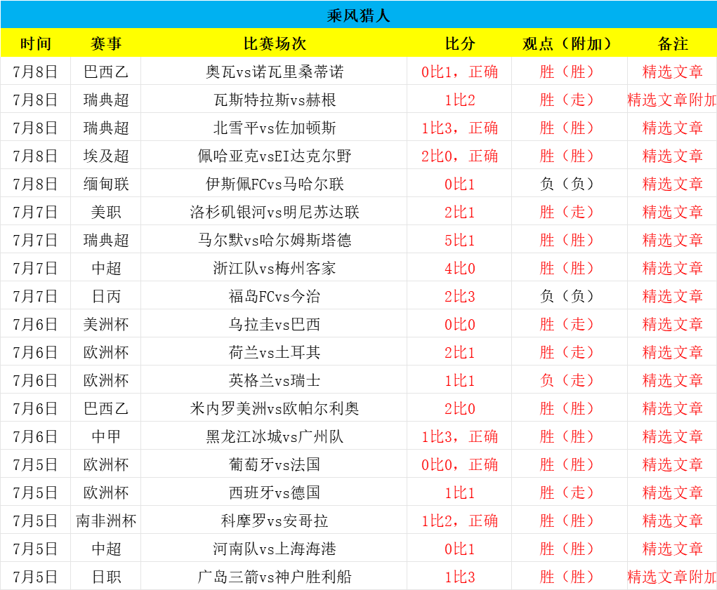 【猎人回顾】各项6连胜(6胜1走)+精选19场17不败!昨天火热大捷,助力瑞典超7场不败,埃及4场不败!近欧洲杯5场不败+欧洲杯34场24不败,淘汰赛12场10不败(淘汰赛胜6场比分)。