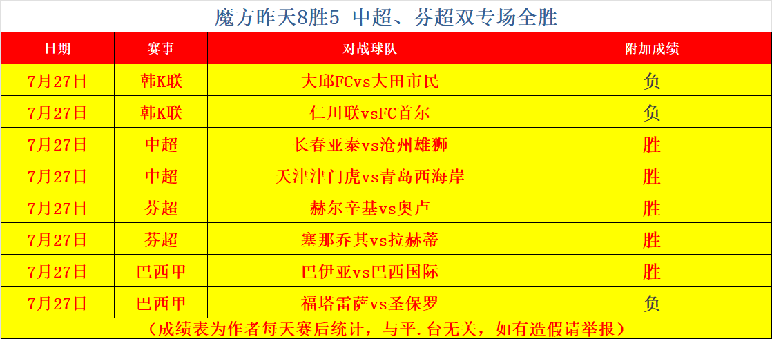 【成绩回顾】魔方昨日保持正值,整体8胜5,其中中超以及芬超两个板块清版全勝。接下来魔方将会不断努力务求精益求精!今日调整状态针对韩K2联、中超、瑞典超以及美赛进行深研。