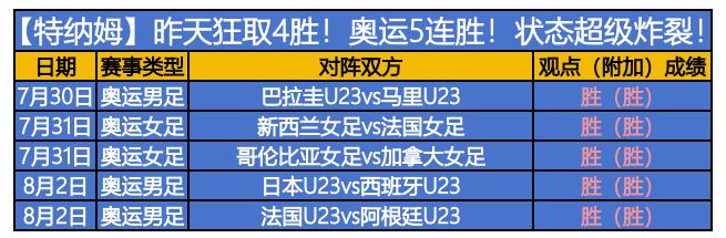【战绩回顾】特纳姆昨天5战狂取4场胜绩,状态炸裂!奥运赛事目前狂取5连胜!今天这场思路相当清晰,称得上强项赛事!力求冲击连胜佳绩!希望大家多多支持!