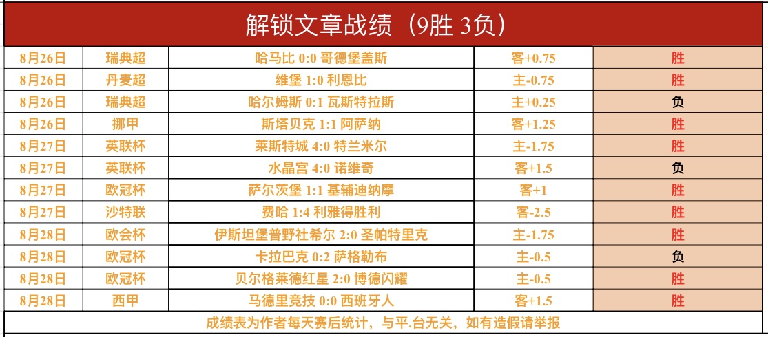 战绩回顾:鸡锅每日精选5-7比赛,追求的是长期稳定的胜利!昨日总计6场比赛,再次拿到4胜2负,整体表现不俗,近3天收获8个单场,很舒服!私推总进球数1场,英联杯纽卡斯尔联小方向轻松全胜,总进球数3连胜,近23胜20,成绩非常出色!私推赞赏1场,英联杯伯恩利没有打出,私推赞赏长期近61失21,成绩稳定!解锁文章4场,拿到3胜1负,西甲西班牙人、欧冠杯贝尔格莱德洪星和欧会杯伊斯坦堡普野胜利,欧冠杯卡拉巴克没有打出!