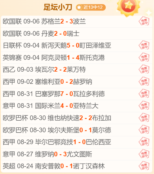 战绩回顾:状态持续稳定!止步11连胜,目前13胜12!昨晚瑞士吃到2红牌,实在没办法!而波兰最后时刻还是拿下!今天欧国联敬请留意!