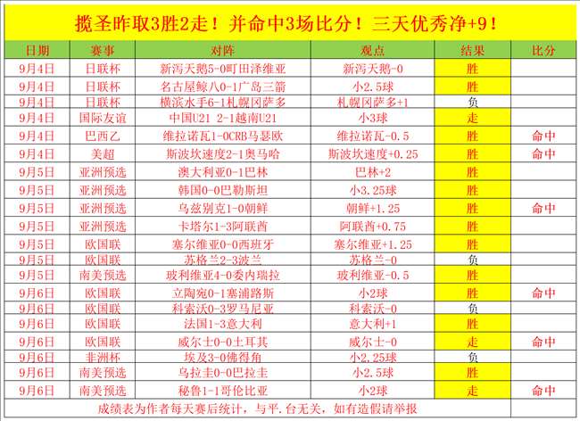成绩回顾:昨天依旧是炸裂的一天,拿下3胜2走,命中3场比分!!!继续保持稳定正向增长!笔者的战绩长期稳定,期间或有些许落差,但笔者都能够迅速调整回来,而且笔者近段时间的排名一直名列前茅,这一点就足以证明笔者的实力了,所以大家可以放心地关注!