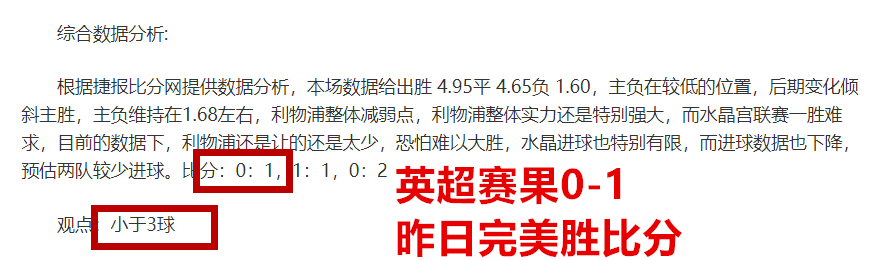 【猎人回顾】昨日推出唯一单英超,水晶宫0-1利物浦,进球告捷,且完美胜比分,状态大涨,今日精研,欢迎关注,力争全胜!
