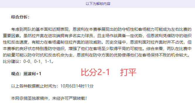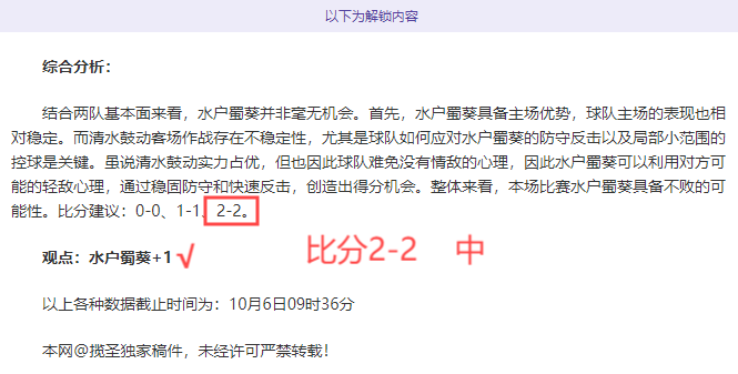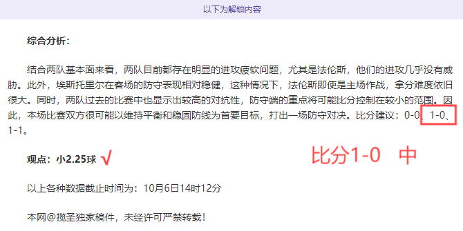 【解锁内容包含:综合判断分析、进球数分析、比分建议】
