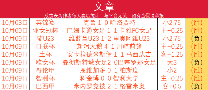 近期文章9中6,状态持续飙升火热。私推方面迎来3连胜,昨天2个全胜,横滨水手1-3名古屋鲸八,拜仁慕尼黑女足5-2阿森纳女足。今天保持好状态,争取更稳更好的表现,一起开启全胜模式。亚州预选近期精选4连胜了,9月10号阿曼1-3韩国,9月10号科威特0-0伊拉克,都红了,强项,经验丰富。