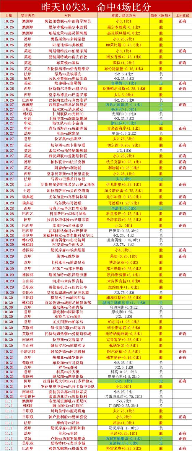 一、战绩回顾:昨天迅速回归正轨,打出8胜5的战绩,10场仅失3,保持净增长,近11天净增+34场,昨天命中4场比分,近11天共命中42场比分,比分含金量依然十足,昨天的2场日职联大获全胜,笔者预测的交叉结果也是稳稳的打出,进球数形成了大和小的交叉,日职联近期取得6连胜,早上的2场美洲赛事1胜1走不败,巴西甲的2比2比分也命中,今天又到了笔者擅长的周末。