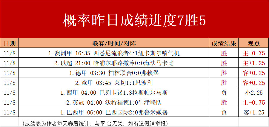 成绩优势汇总:昨天已完成赛程进度取得7胜5的优秀成绩,以优秀的状态步入周末的收官赛程,延续优势状态,本日继续精选焦点赛程出击!
