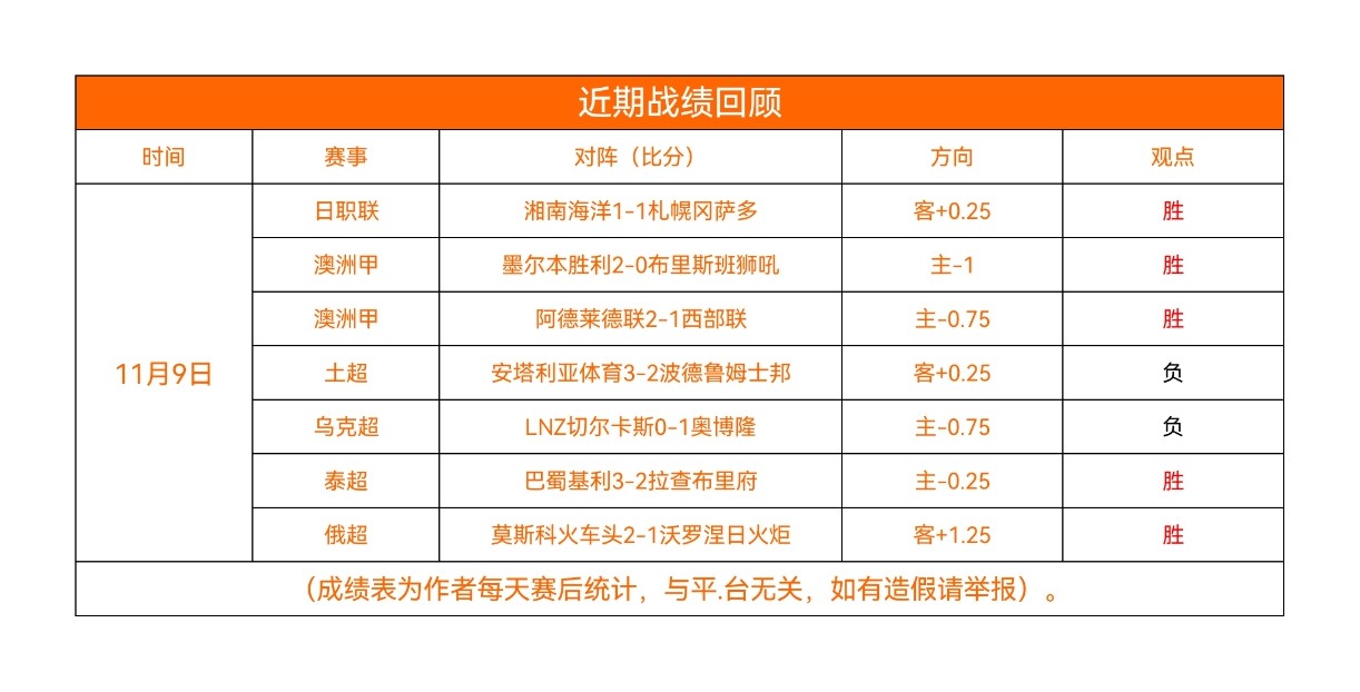 战绩回顾:昨天整体成绩7胜5,公推日职联再次取胜,近期公推取得5胜4,另外澳洲甲的两场比赛轻松拿捏,遗憾的是土超以及乌克超的比赛未能拿下,今天再接再厉,再创胜绩。