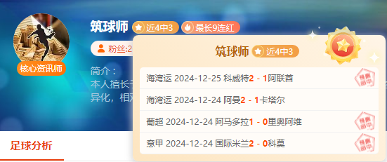 成绩回顾:近4胜3,近期的状态还是相当炸的成绩;今天笔者会继续会秉承宁缺毋滥的精神,只推有质量有信心的比赛而不是数量搭够,确保每一场比赛都有命中率的;今天笔者同样挑选出信心场次,望大伙们可以一起与筑球师研究胜利的观点。
