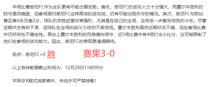 《战绩回顾讲述》昨天澳洲甲:悉尼FC3-0大胜墨尔本胜利,悉尼FC方向准确打出;意甲:恩波利1-2不敌热那亚,热那亚方向准确打出。