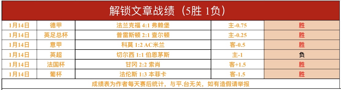 战绩回顾:昨日总计8战,拿到6胜2负,成绩出色!私推赞赏1场,德甲勒沃库森没有打出!私推总进球数1场,苏冠艾尔联大方向胜利,总进球数近14胜10!解锁文章昨日6战拿到5胜1负的战绩,成绩很出色!德甲法兰克福、意甲AC米兰、法国杯索肖、葡杯本菲卡和足总杯普雷斯顿胜利,英超切尔西没有打出!