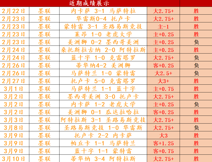 上轮回顾:目前美洲的整体走势非常理想,8连胜佳绩彰显实力。其中墨联的表现同样走势喜人,目前墨联34胜28+豪取4连胜,欢迎关注。