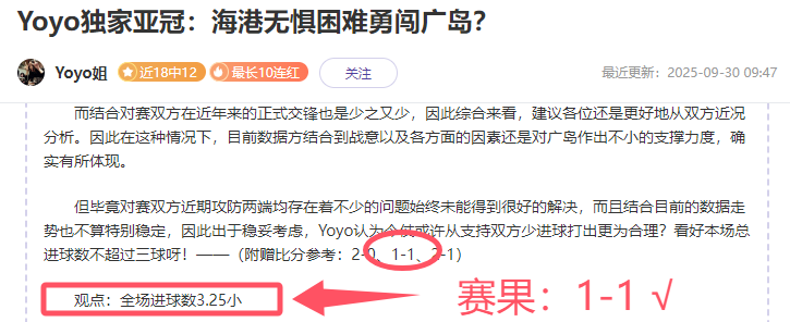 【上期回顾】:前天私推略感遗憾,不过近5胜4表现不俗!而超级重点亚冠方案成功重返胜轨,近14胜10状态尚可!——今天核心赛事已确认,信心依旧,各位可点击一下【赞赏】按钮给予鼓励,轻松在“站内信”获取当天新鲜信心专场哦!多一份参考离喜悦再近一步,Yoyo将继续率粉粉们继续前行~