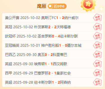 成绩回顾:昨日再次斩获4连胜!目前成绩8连胜!感谢一直以来的支持与陪伴,今天看好不错的赛事,强项赛事很有信心,鹰雁也曾创下19连胜的超高记录。愿大家在观赛的同时,也能收获满满的喜悦与惊喜,觉得还行的不妨继续关注,一起开启精彩的足球之旅。