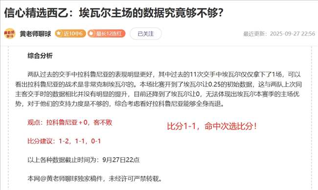 黄老师致力于研究各大赛事数据,拥有自己独创的数据模型,挑选的每场比赛都精心研究,我们以长线为主,长期效益非常不错,适合持续关注,保持一个好心态,我们一起共同进步!以下解锁内容包含:综合分析+观点方向+比分预测