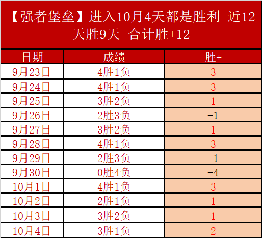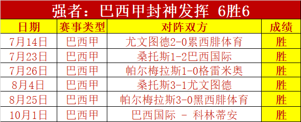 巴西甲近6胜6,王牌赛事再出制胜法宝。昨天4胜3,进入10月已经四天时间了,每天都是胜利成绩,近12天胜9天合计胜+12,显然胜利的绝对优势占据主导