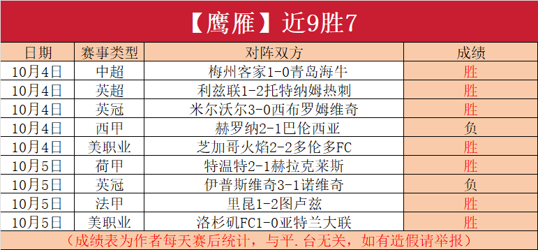 成绩回顾:昨日5场比赛仅仅败了一阵。目前成绩十分稳定,近9胜7。本月最高打出12连胜。感谢一直以来的支持与陪伴,今天看好不错的赛事,强项赛事很有信心,鹰雁也曾创下19连胜的超高记录。愿大家在观赛的同时,也能收获满满的喜悦与惊喜,觉得还行的不妨继续关注,一起开启精彩的足球之旅。