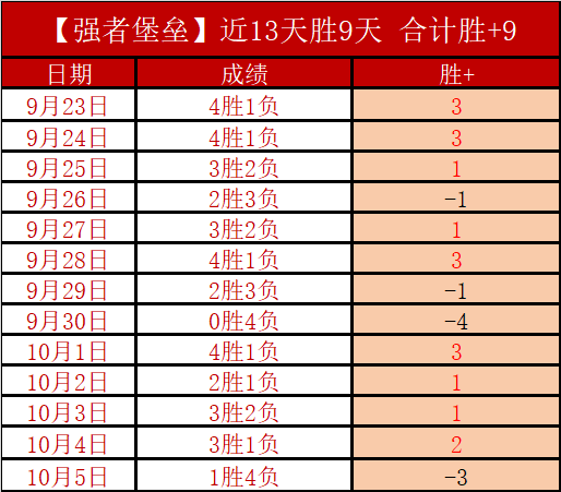 进入十月5天胜4天,近13天胜利发挥9天,合计胜+9,显然胜利的绝对优势占据主导