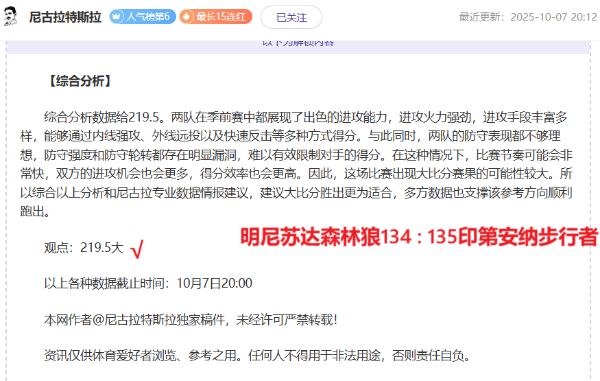 【成绩回顾】昨拿下二战胜,NBA和昨夜场胜,今天情报数据再升级冲击连胜,尼古拉资深作者情报解读再有方法,信心强项情报解读连胜赛事再次出发,长期解读惊喜不断,此前作者创下4次双位数胜战绩,掌握着一手赛事资深情报,本期继续分享充满奇妙体育赛事,敬请大家持续关注!!