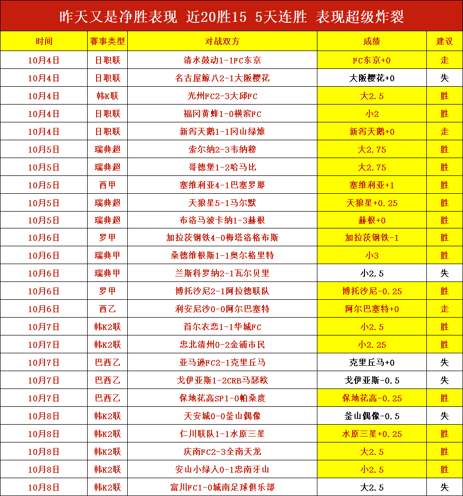 雪球丸成绩节节攀升!连胜5天!净胜+10场!拿下20胜15的表现,成绩说话!强项赛事稳的绝对有保证!今天赛事依旧选择强项系列,持续稳,别错过了!笔者近期前进脚步表现仍然优秀,本日赛程继续出击,争取在稳健的基础上进一步突破!