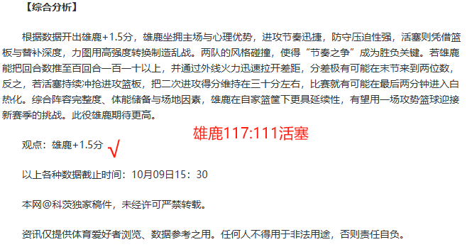 【上期回顾】上期雄鹿VS活塞获胜,作者悉心分析每一场赛事情报,在早前曾创下了10连胜佳绩并且多次拿下连胜,老牌作者给出的情报旗开得胜印证了老牌作者的实力并非空穴来风。新一期的赛事期待与大家携手再创辉煌,能够凭借丰富的经验轻松化解比赛难题!