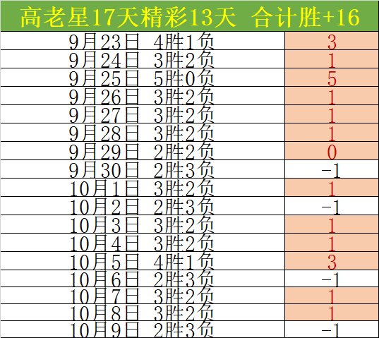 预选9胜6,预选赛事的分析思维还是值得肯定的。17天精彩13天,合计胜+16,令人惊叹的胜+值得骄傲,胜利清晰地占据主流。