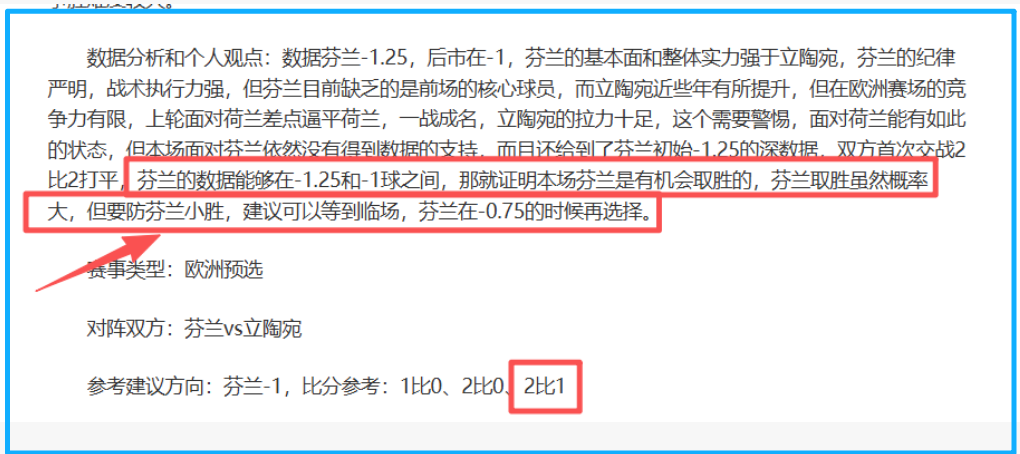 超强预测:值得一提的是昨天公推的超强预测,芬兰的小胜思路十分准确,也提醒大家等到临场选择-0.75,比分也命中,笔者会在分析当中加以提醒,尽量让大家增值最大化。
