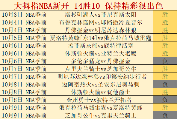 NBA新赛季开启保持精彩,现在近14胜10很出色。昨天拿下胜利,4号开启精彩,近28胜18合计胜+8,进入10月保持精彩走势!