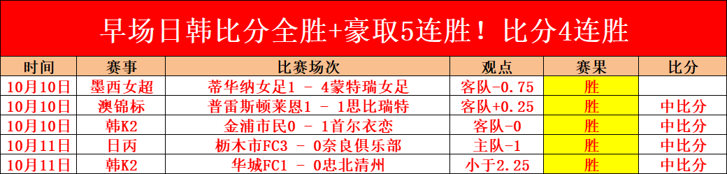 【战绩回顾】早场日韩3场全胜比分,豪取5连胜+比分4连胜,助力日系9连胜!韩K2赛事6连胜!美洲赛事10胜9,澳系4连胜!今日比赛质量佳!乘胜追击,信心强烈,全力分析,只王牌精研有把握的比赛,继续拿下,加油冲全胜!欢迎长期关注猎人。
