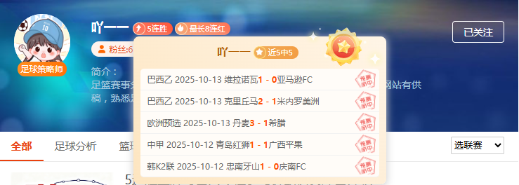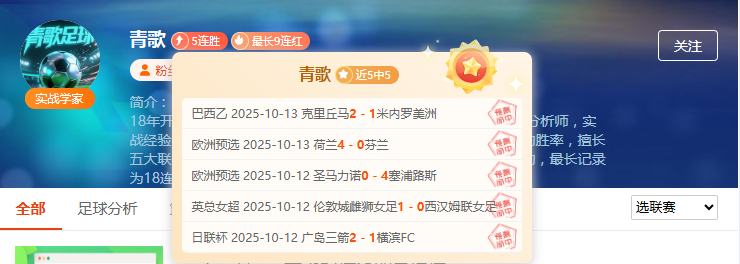 老牌分析师“青歌”- 5连胜 - 5场全中彰显18年经验实力!巴西乙克里丘马vs米内罗美洲、欧洲预选荷兰vs芬兰、圣马力诺vs塞浦路斯完美命中,从南美到欧洲全方位覆盖;经验派分析师助你稳操胜券!