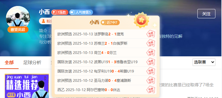 人气实力作者“小西”- 7连胜 - 强势领跑!欧洲预选4连胜法罗群岛vs捷克、苏格兰vs白俄罗斯、荷兰vs芬兰、圣马力诺vs塞浦路斯全部命中,青年联赛精准把握,连胜王者带你"盈"遍欧陆赛场;次日凌晨还有欧洲预选赛,跟紧小西脚步关注小西专栏,第一时间获取文章解读!