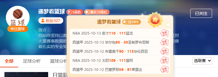 实力篮球作者“遥梦看篮球”- 5连胜 - 横扫NBA与西篮甲!奇才vs猛龙精准拿捏、太阳vs篮网的赛果也不在话下精准命中,季前赛+欧洲篮球深度剖析;篮球赛事精准制导专家已就位,跟紧遥梦收割连红!