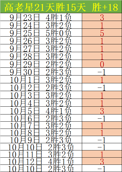 近21天胜15天,合计胜+18,值得认可的胜+,令人惊叹的胜+值得骄傲,胜利清晰地占据主流。