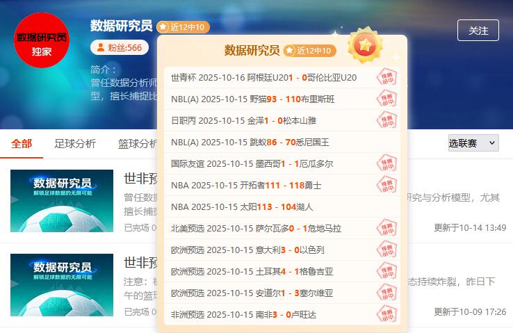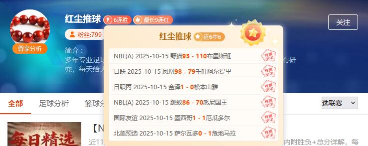 “红尘推球”保持6连胜火热状态,拥有799名忠实粉丝!毕竟也是“多年专业足球研究”的老牌分析师了,其推荐覆盖NBL、日职、北美预选等全球赛事,昨日连中野猫vs布里斯班等比赛,实战中注重球队战意与指数结合。若您需要全联赛实战指南,这位尊享分析师是理想选择!