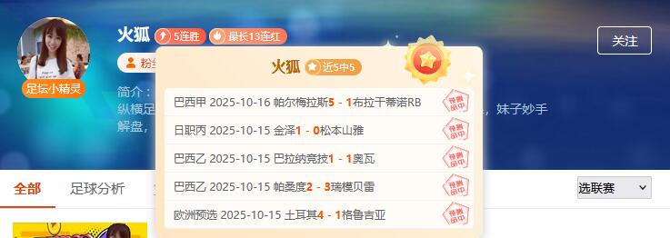 “火狐”的5连胜+最长13连红凸显深厚功底,近期精准命中帕尔梅拉斯等赛事,擅长从巴西乙、日职丙等小众联赛挖掘价值。分析风格结合数据与临场情报,每场推荐附带深度解读。关注这位“足坛小精灵”,收获独特赛事视角!