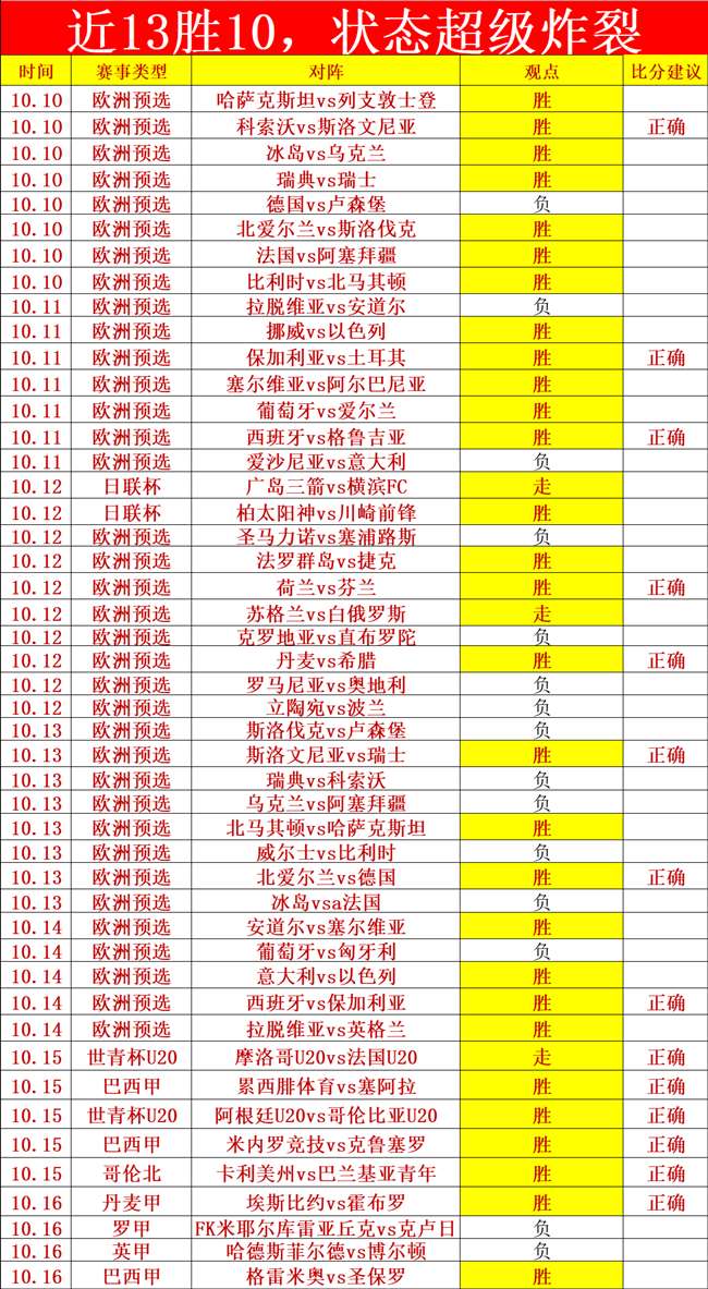 二、欧洲预选佳绩:连续6天的欧洲预选结束了,笔者创造了惊人的战绩,欧洲预选6天合计观点拿下39胜25的佳绩,命中11场比分。
