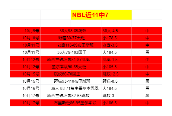 NBL终于结束连败,应该引来连胜时刻了,近11中7,用心做足功课争取拿下,走的是长期稳定路线 才是最牛的 .