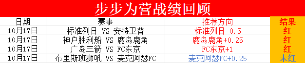昨天4中3,两场日职顺利跑出,夜场比甲标准列日腰斩,但赛事走向也如笔者所想,唯一遗憾就是早场澳超没有打出,目前近4中3!今天继续带领大家收获成功;五星级菜单方面,昨天德罗赫达联1-0击败科克城,德罗赫达联-0.75顺利命中,五星级菜单3连胜!想要获得五星级菜单的朋友可以在打赏文章下方点击打赏88球币即可获得推送。
