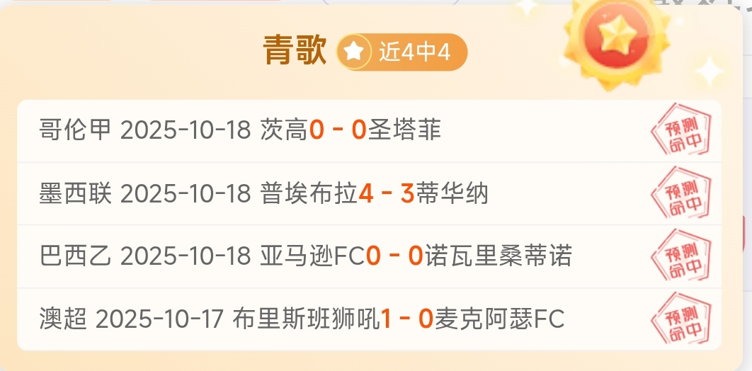 青歌简报:昨日表现不俗。澳超一胜一平,拿手巴西乙顺利打出,高歌猛进的势头开启周末征程!再次感谢老哥们的大力支持!!!