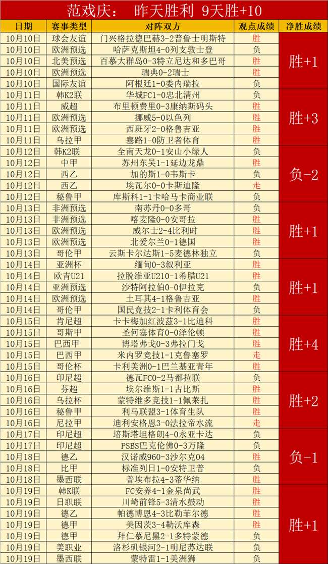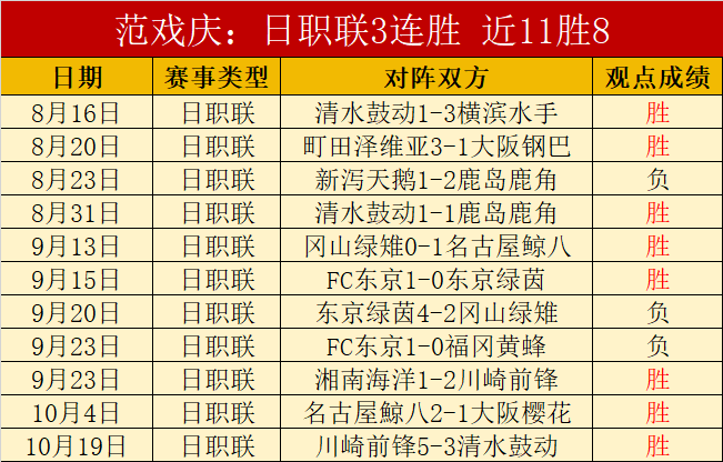 日职联昨胜利,现在3胜3,近11胜8,日韩早场很精彩昨天全胜。昨胜利,9天胜7天,合计胜+10,周末将会更精彩。9月15日打出10连胜,17连胜记录也是在近期出现的,大胜是频繁出现的高超实力。
