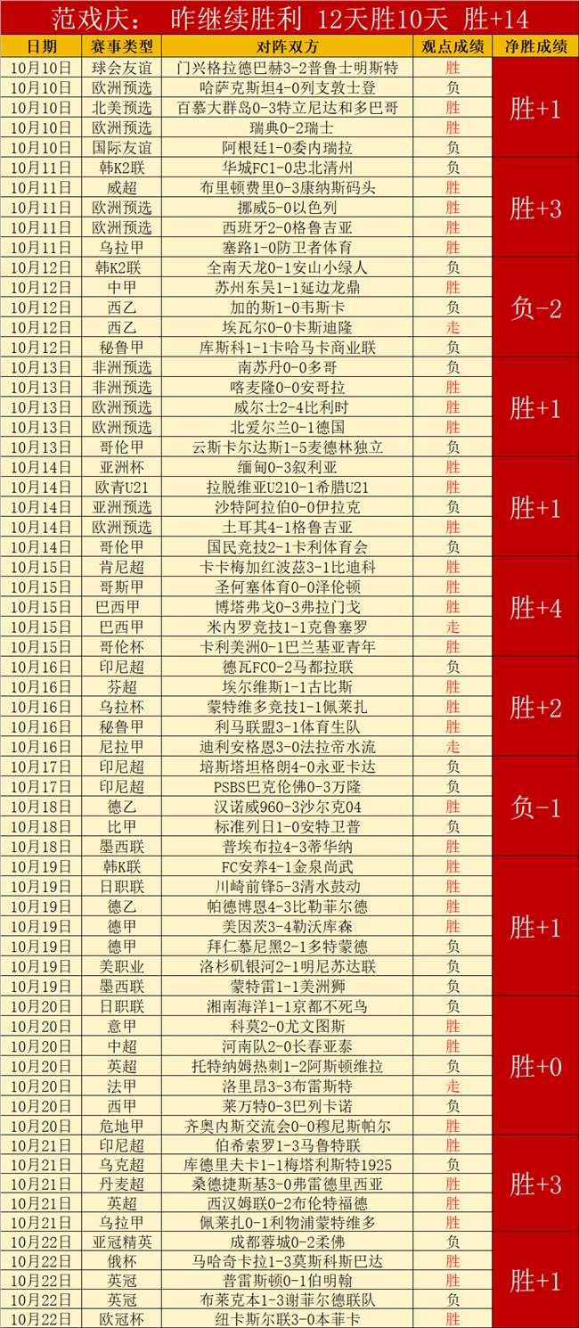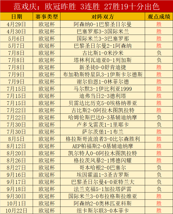 欧冠昨天胜利,目前3连胜,27场胜19场,贡献胜+11,欧冠长时段保持精彩。昨胜发挥,精彩连续4天,12天胜10天,合计胜+14,胜+表现尤其突出。9月15日打出10连胜,17连胜记录也是在近期出现的,大胜是频繁出现的高超实力。