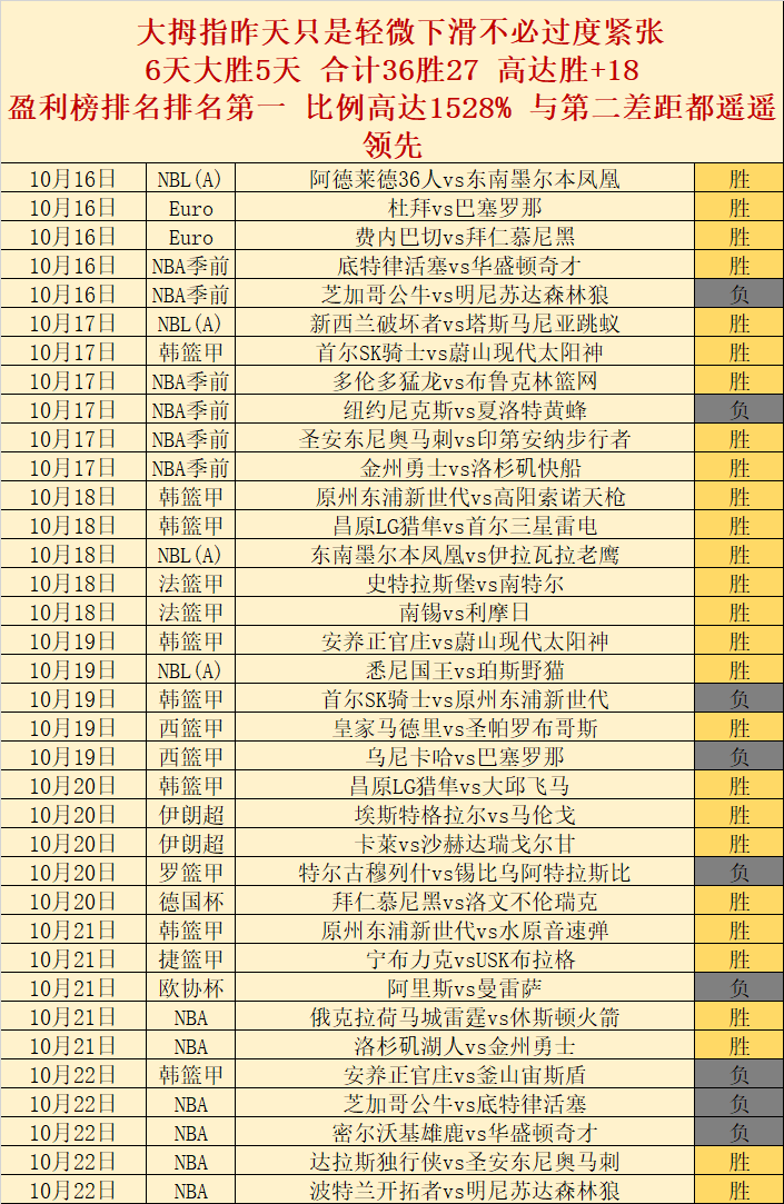 NBA8胜6很精彩。昨天只是轻微下滑不必过度紧张,6天大胜5天 合计36胜27 高达胜+18,盈榜排名排名第一 比例高达1528% 与第二差距都遥遥领先!
