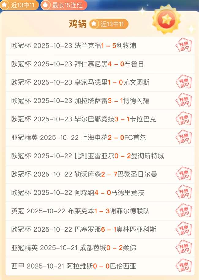 最近更新:2025-10-23 22:50 近13中11最长15连红