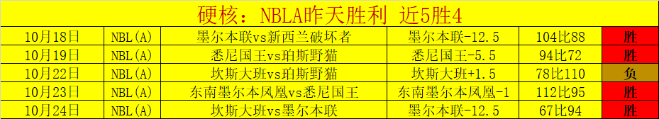 NBLA昨胜,目前5胜4。18号至今取得20胜9负,胜+11很出色!