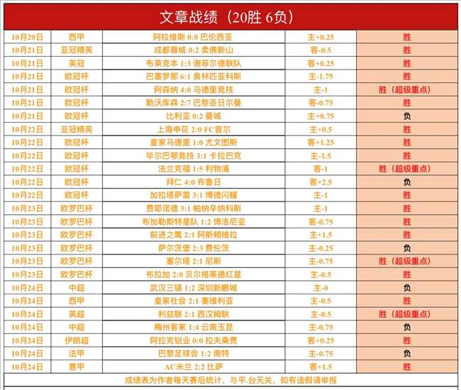 战绩回顾:文章超级强势26胜20!昨日解锁文章6战拿到3胜3负,解锁文章近23胜17,成绩很出色!总进球数1场,中超武汉三镇大方向完美全胜,总进球数拿到连胜!赞赏数据2场,结果1胜1负,赞赏数据近23胜16,成绩出色!鸡锅不追求场次多,追求少而精准,绝不滥竽充数,必须把老铁们的每一份信任都转化为胜利!