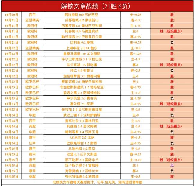 战绩回顾:解锁文章近27胜21,很强势!昨日解锁文章6战拿到4胜1平1负,解锁文章近27胜21,成绩很出色!总进球数1场,匈甲没有打出,总进球数连胜被终结了!赞赏数据没有发送,赞赏数据依然近23胜16,成绩出色!鸡锅不追求场次多,追求少而精准,绝不滥竽充数,必须把老铁们的每一份信任都转化为胜利!