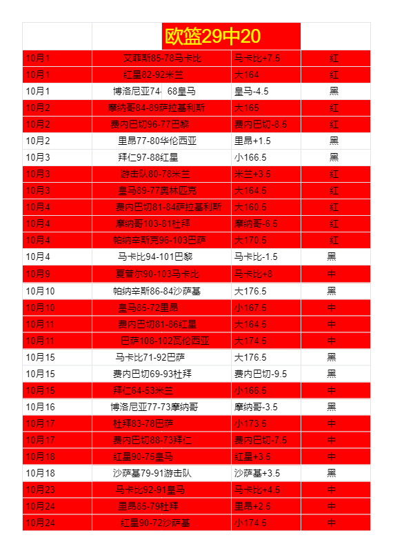 欧篮近29中20,公推一场,精选一场稳定前进,做好赛前分析走的是长期稳定路线 才是最牛的.