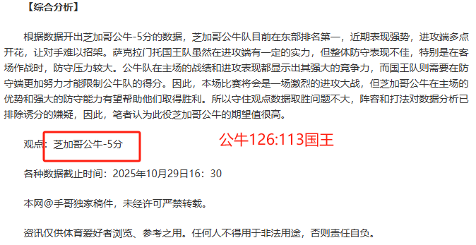 赛事回顾:昨公牛VS国王取胜,作者潜心专研各大联赛的动态,本场作者演算优越概率再分析精彩赛事!运用大量篮球知识演算赛事分享给大家,专业的赛事分析有目共睹!深度调整过后将奉上精彩的赛事情报!紧随作者的步伐,收获胜利并非难事!